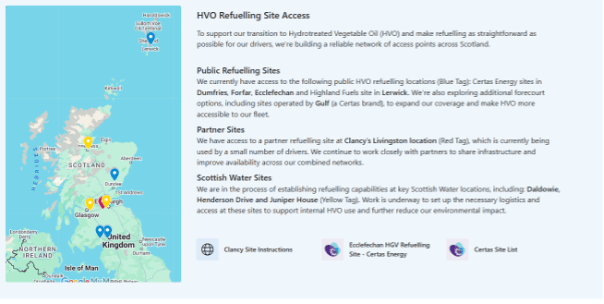 Currently, Scottish Water has access to the following public HVO refuelling locations (Blue Tag): Certas Energy sites in Dumfries, Forfar, Ecclefechan and Highland Fuels site in Lerwick. Additional forecourt options are also being explored, including sites operated by Gulf (a Certas brand), to expand coverage and make HVO more accessible.