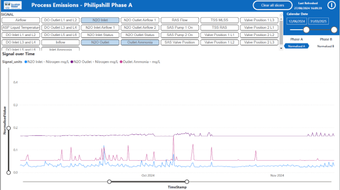 Phillipshill is a medium sized waste water treatment works in East Kilbride. Its secondary treatment is split between two phases: Phase A treats 30% of screened sewage and Phase B treats 70% of screened sewage. We are monitoring nitrous oxide (N2O) using liquid phase N2O sensors in both Phase A and Phase B. This allows us to get actual site-wide nitrous oxide emission factors (EF) for reporting rather than using national Carbon Accounting Workbook (CAW) factors. Philipshill is also the first site where we have deployed our flux gas hood monitoring to validate the data we are receiving from the liquid phase probes, ensuring we have reliable data for reporting and to inform our future process emission mitigation actions. We are one of the first water utilities in the UK to deploy gas hoods for process emission validation.